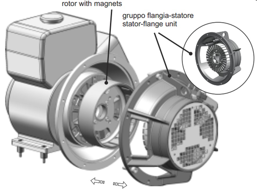 1、合能智慧动力源采用合能无轴承永磁同步发电机技术,与同类产品相比,它的发电机省去了联轴器、前端盖、前后轴承和电机轴,发电机与柴油机或汽油机合为一体,比同类产品体积小、重量轻、成本低。节省车辆宝贵的空间。